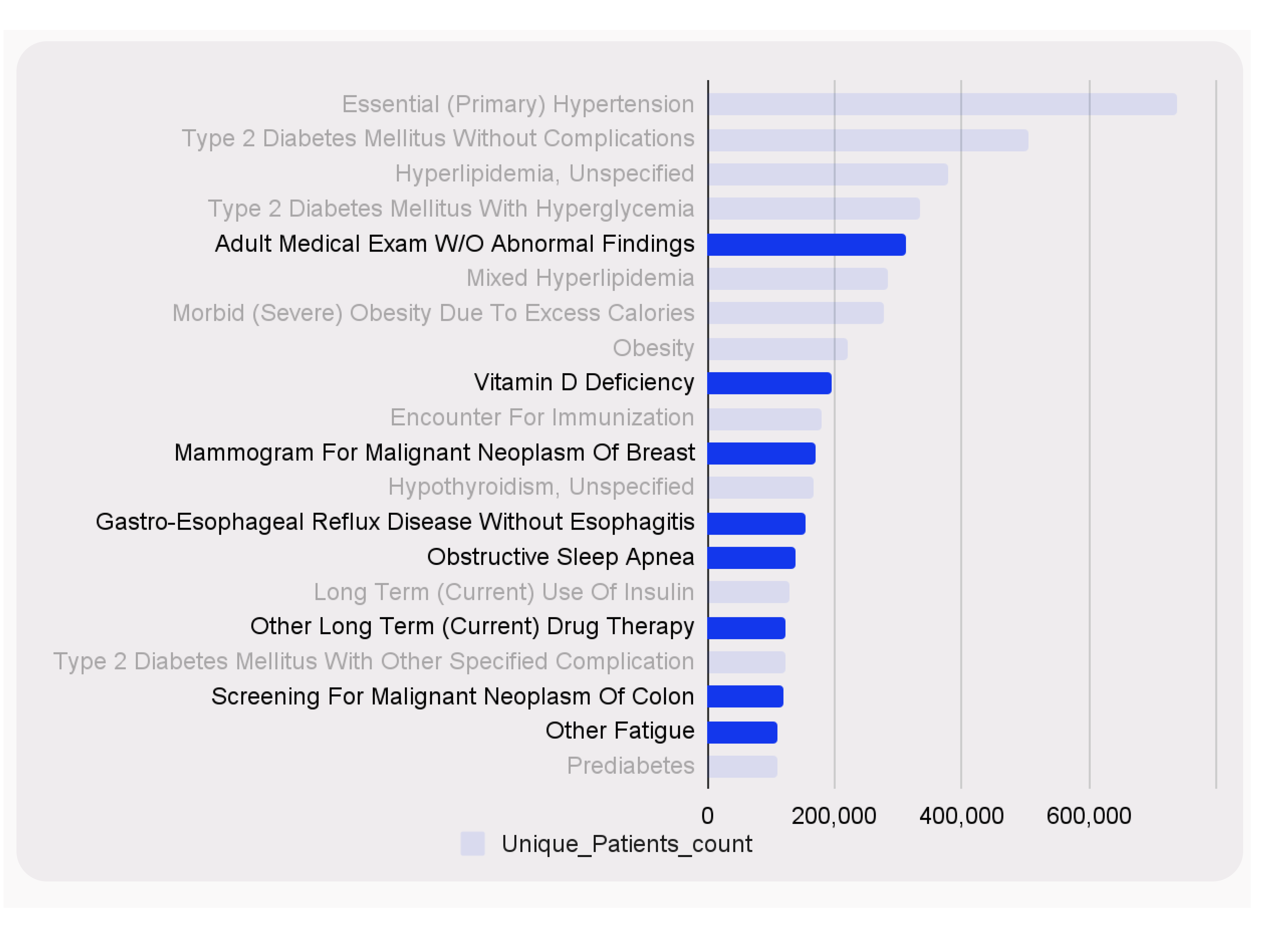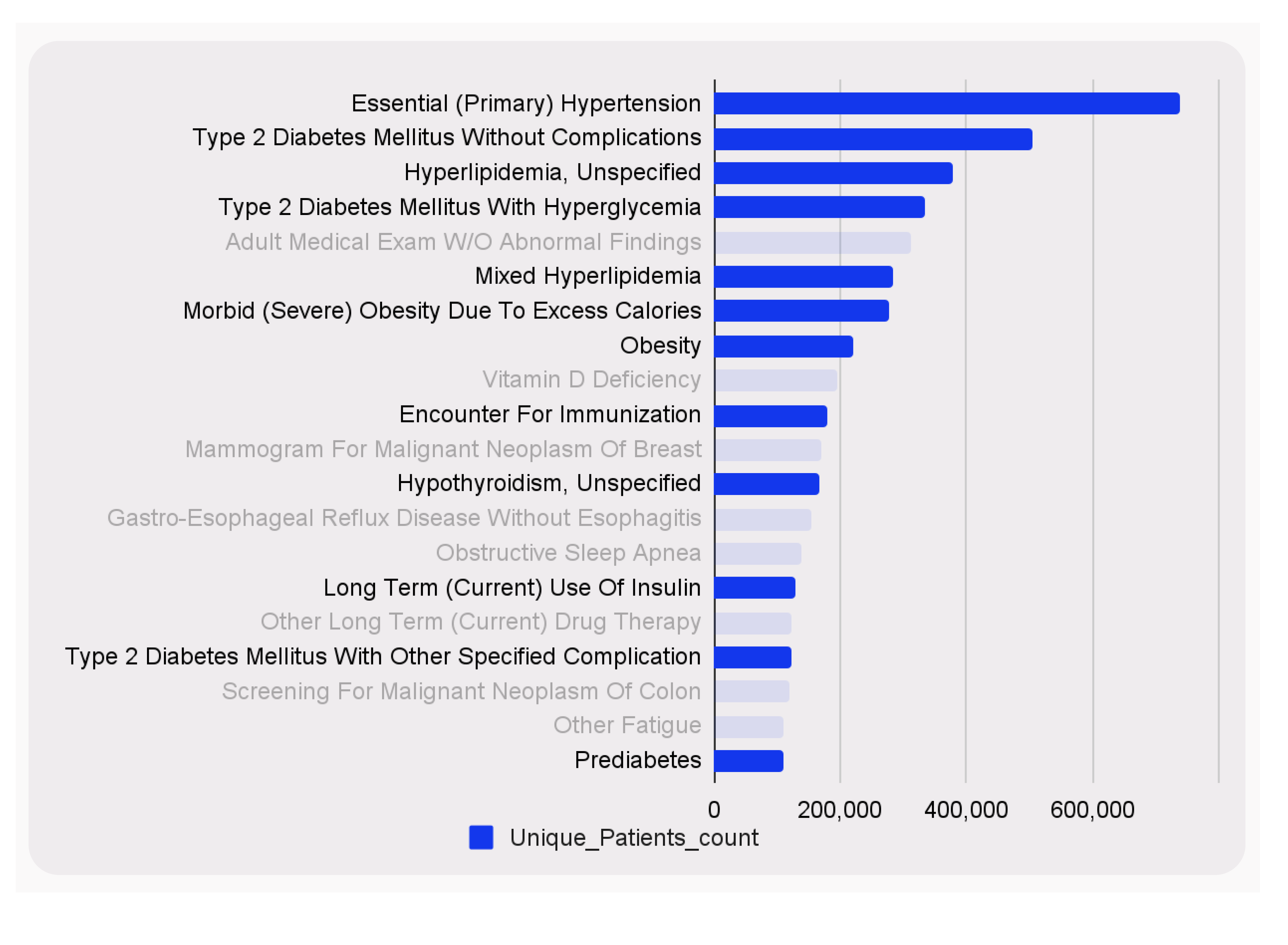 AI reveals strong overlap between metabolic syndrome indicators and GLP-1 prescribing. Hypertension, Type 2 Diabetes, hyperlipidemia, and obesity consistently lead confirming that prescribing is driven by active clinical signals, not historical scripts.