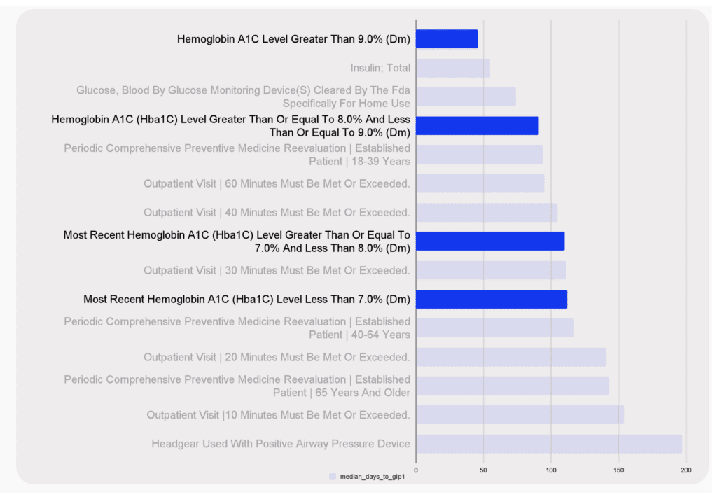 Timing sharpens this further. If a patient’s most recent Hemoglobin A1C is greater than 9.0%, they are, on average, roughly 45 days away from a GLP-1 prescription.
