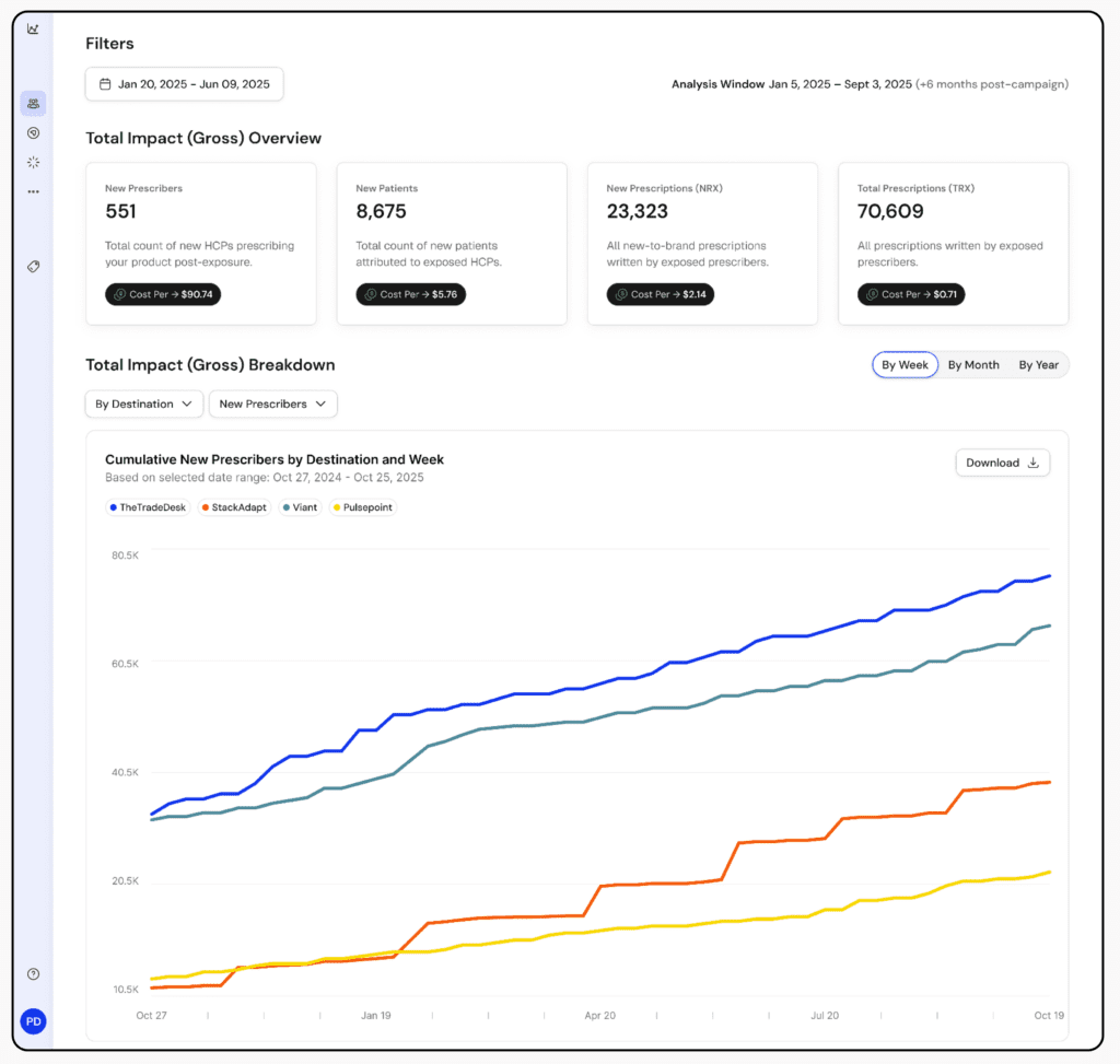 Attribution tells you who saw an ad. Lift measurement tells you whether the campaign had any effect on behavior isolated from everything else your brand is doing to convert prescribers. They’re related but distinct questions.