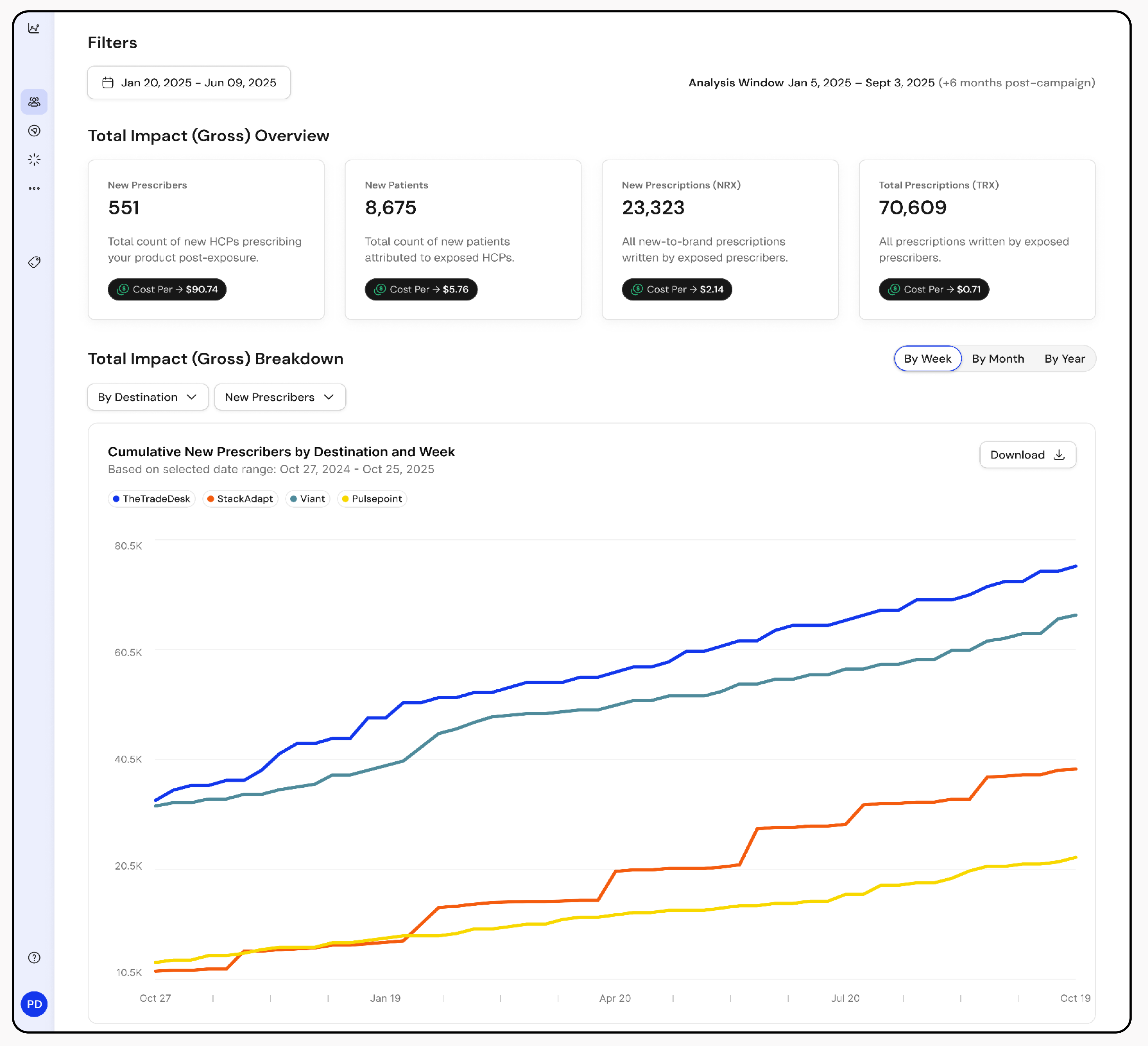 For example, if exposed providers write an average of 12 new scripts per month versus 9 for the control group, that 3-script difference represents a 33% lift attributable to the campaign — not market trends, not seasonality, not coincidence.