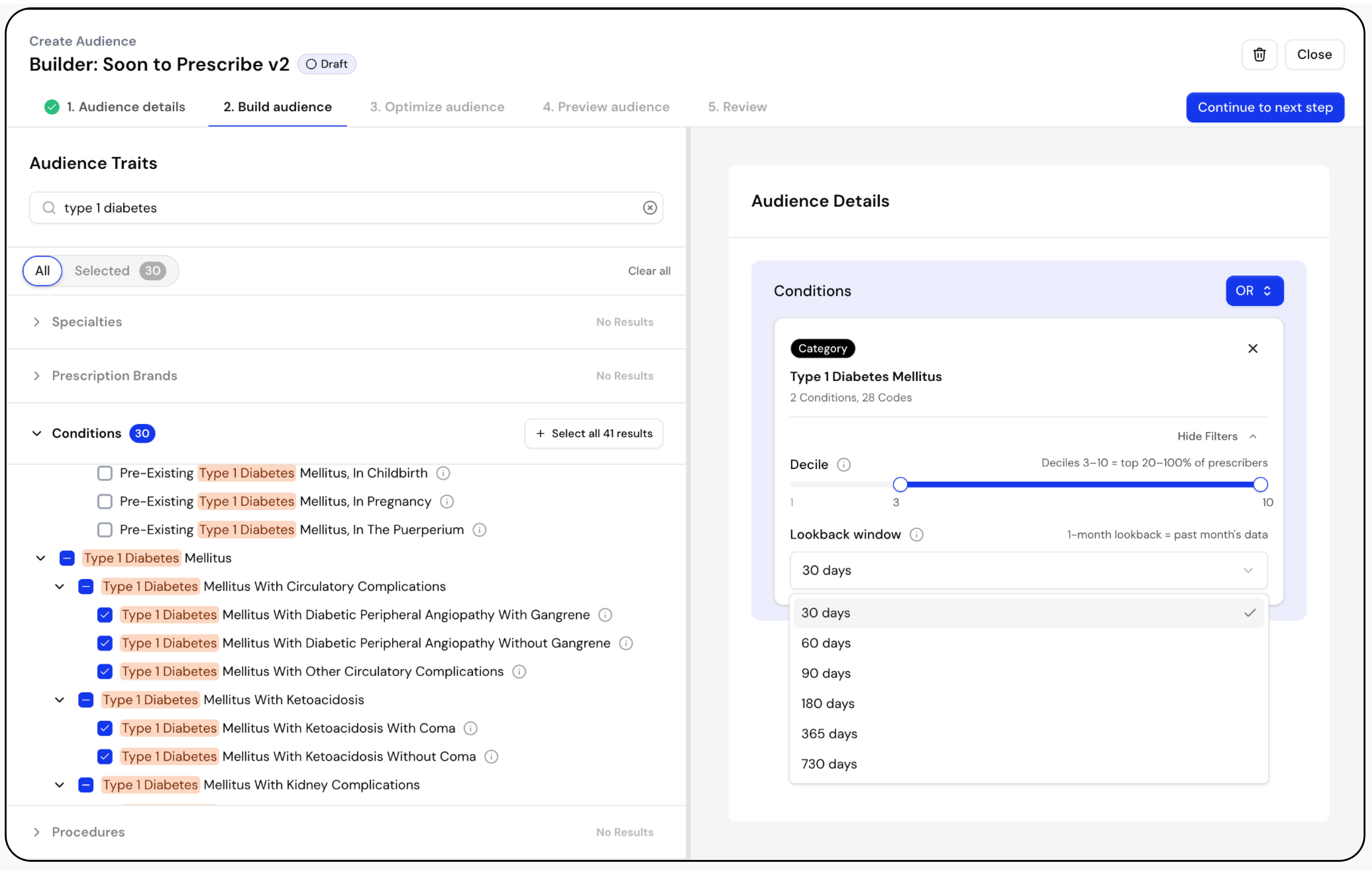Filter by prescription brand, decile, and lookback window to reach providers actively managing relevant patients right now.