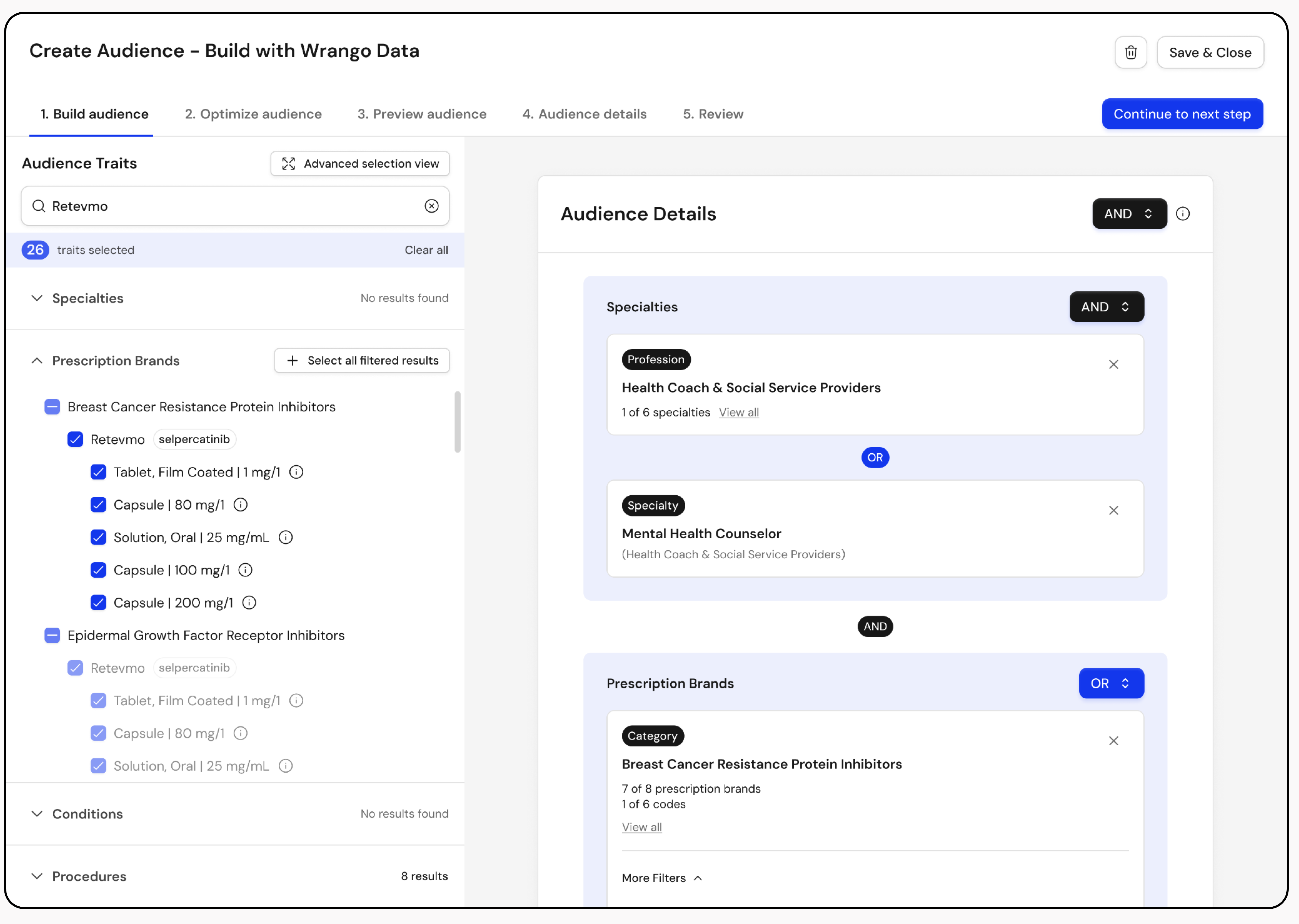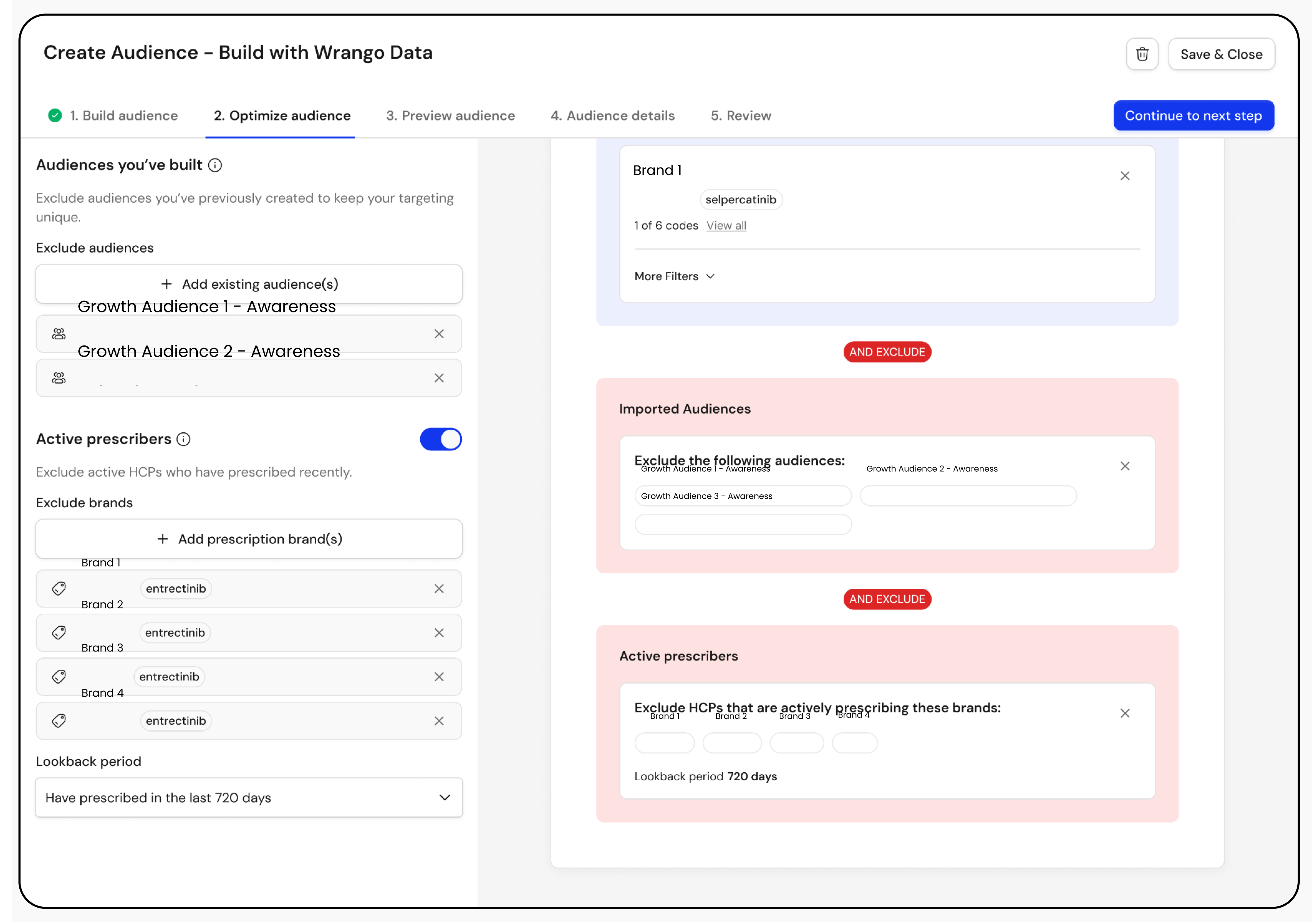 Once the audience is built, Wrango’s optimization step lets users refine further suppressing existing segments and excluding currently active prescribers to keep targeting precise.