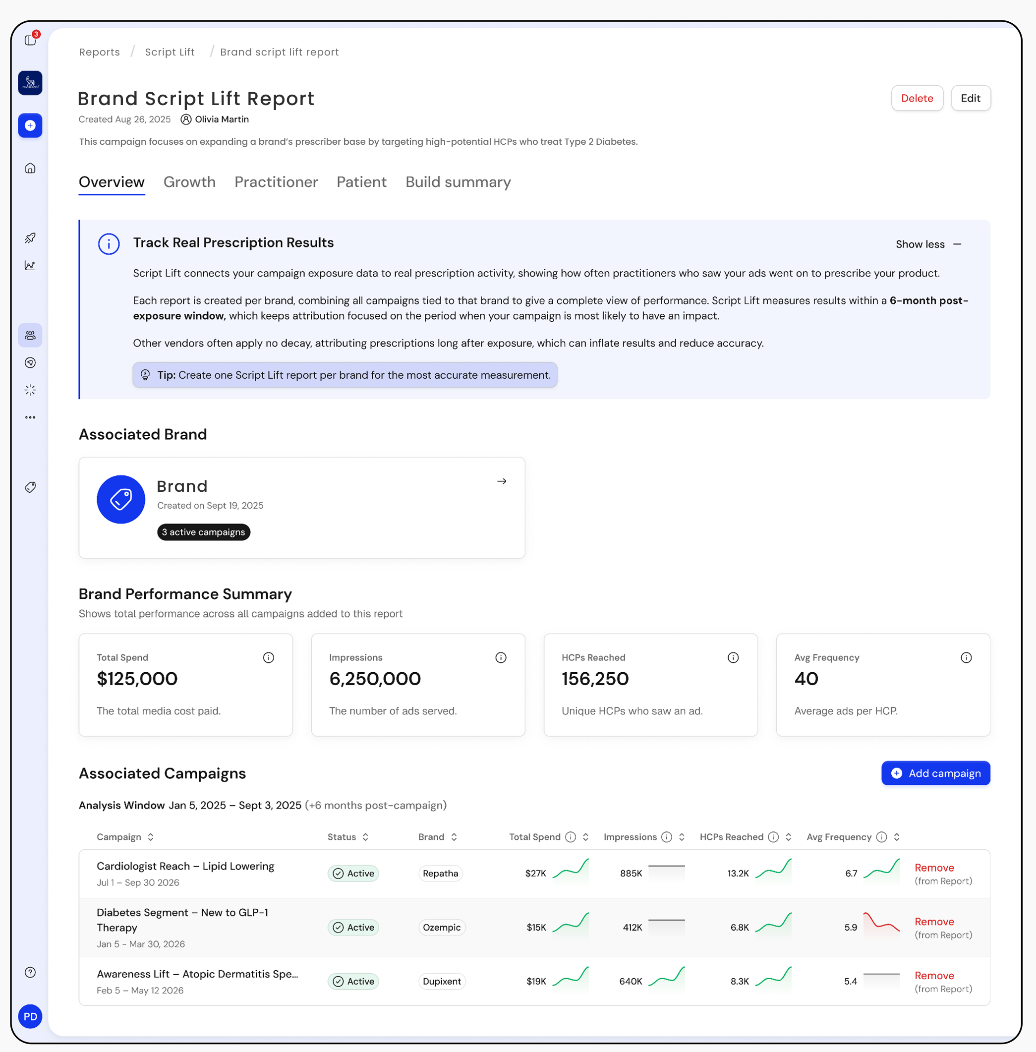 Wrango’s script lift report connects ad exposure to real prescribing outcomes showing new prescribers, new patients, and prescription growth against a control group, broken down by campaign.